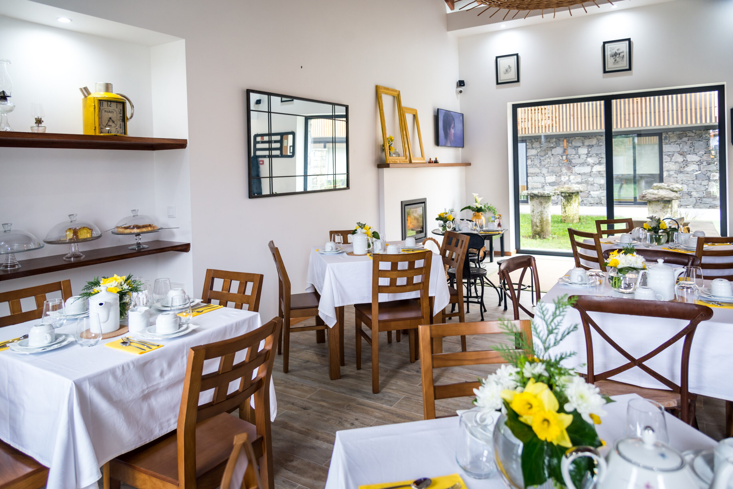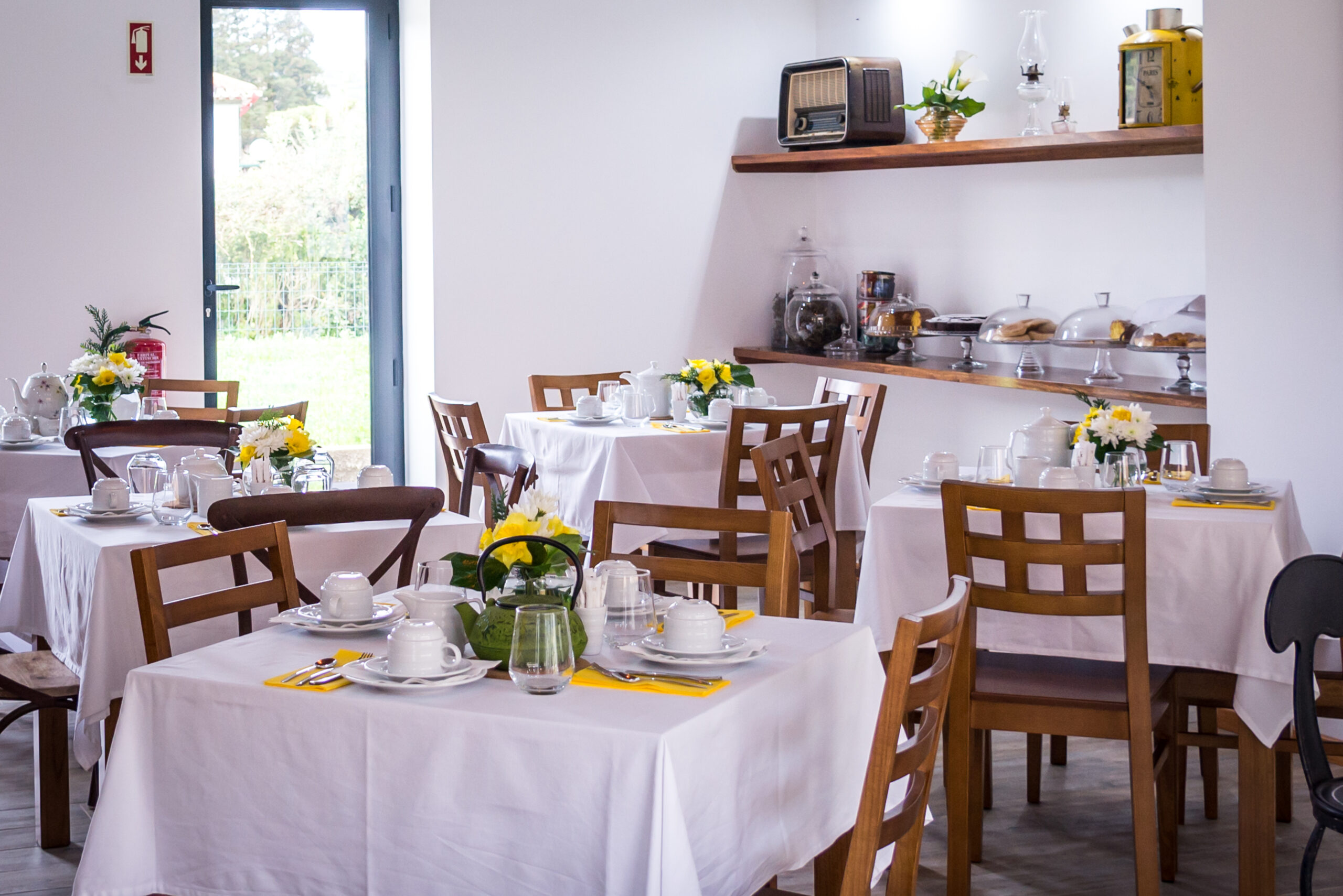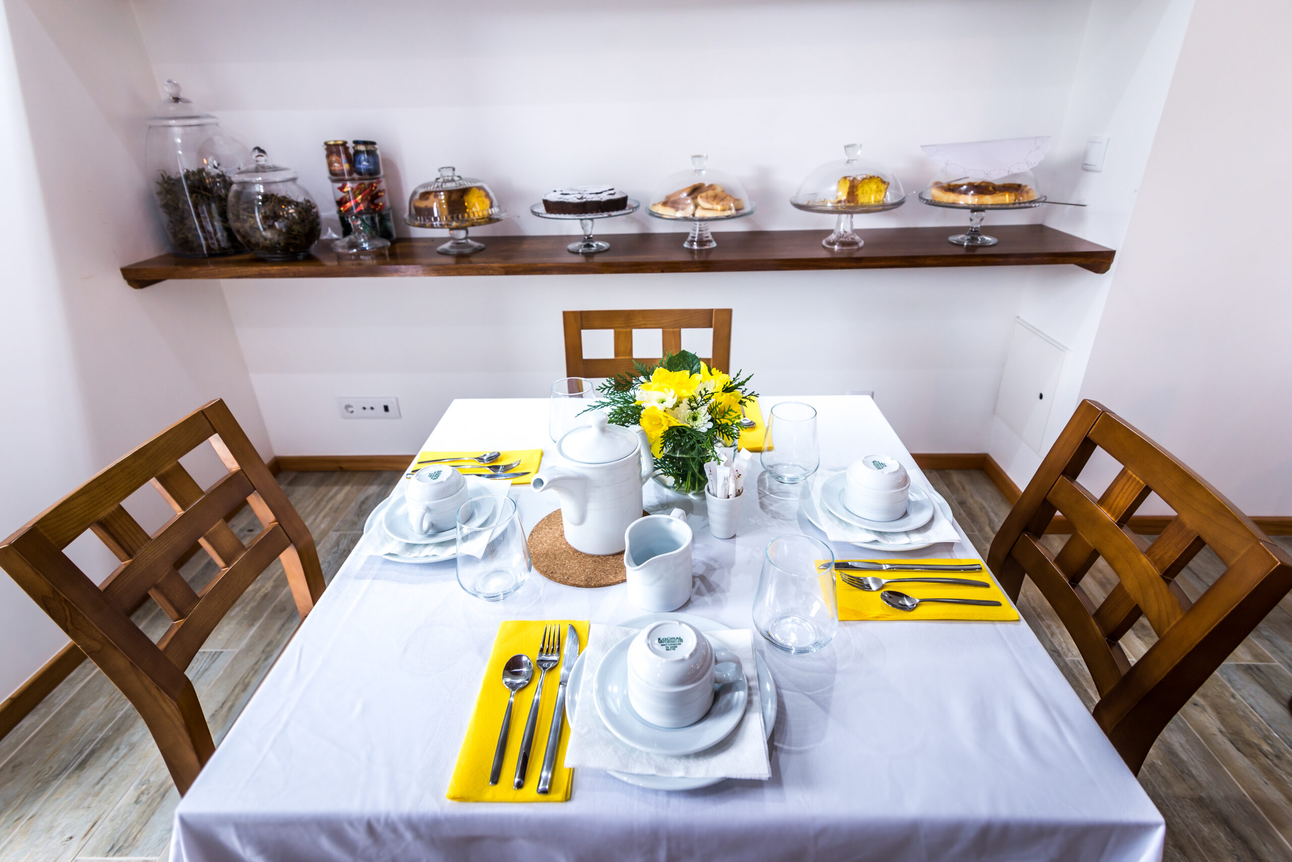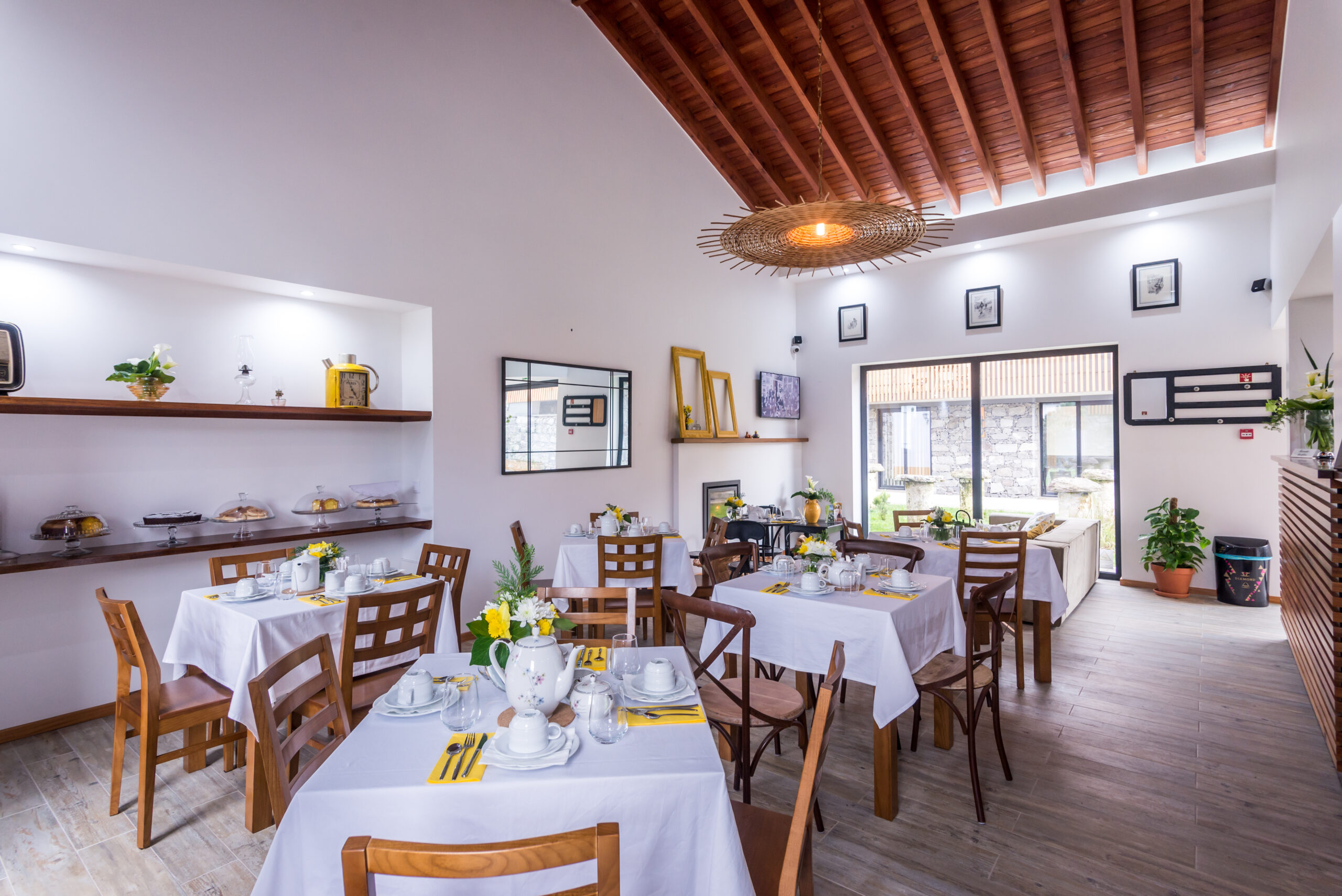 A sala de chá surge neste empreendimento como espaço de divulgação dos sabores tradicionais de doçaria e padaria, chás, licores, entre outros produtos únicos desta região servidos nos pequenos-almoços, lanches ou merendas. Visa, em primeiro lugar, a promoção dos produtos regionais bem como, a promoção de produtos nacionais. Neste espaço o cliente é recebido numa sala com ambiente confortável, sempre ornamentada com flores naturais de acordo com a época e estação do ano, bem como dias festivos a comemorar. Nesta sala, a presença das madeiras é uma constante assim como, o trabalho manual de artesãs em alguns adornos/adereços a utilizar como por exemplo nas toalhas de resguardo das cestas de pão, biscoiteiras, fundos de tabuleiros, entre outros. A sala possui uma lareira, alimentada a lenha, que é acesa sempre que necessário a fim de proporcionar mais conforto e bem-estar a quem nos visita. A degustação dos nossos produtos é feita em ambiente calmo, acolhedor e de cariz familiar, onde a música é uma constante. Se o cliente preferir poderá usufruir de uma esplanada ao ar livre, coberta ou não, adjacente à sala de chá. Os produtos vendidos são confecionados, na cozinha do empreendimento usando sempre produtos frescos de qualidade, típicos de cada época e característicos da nossa região.