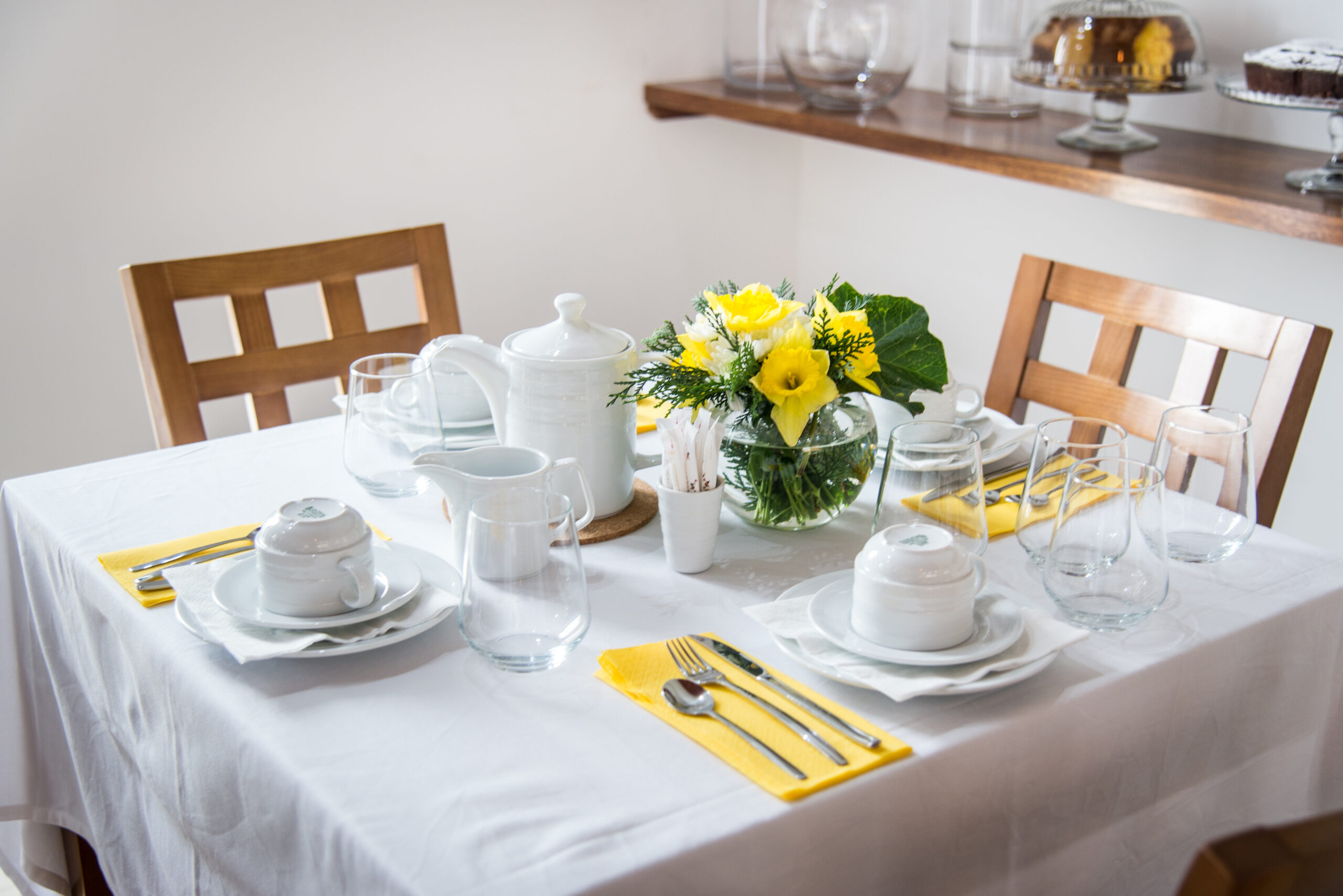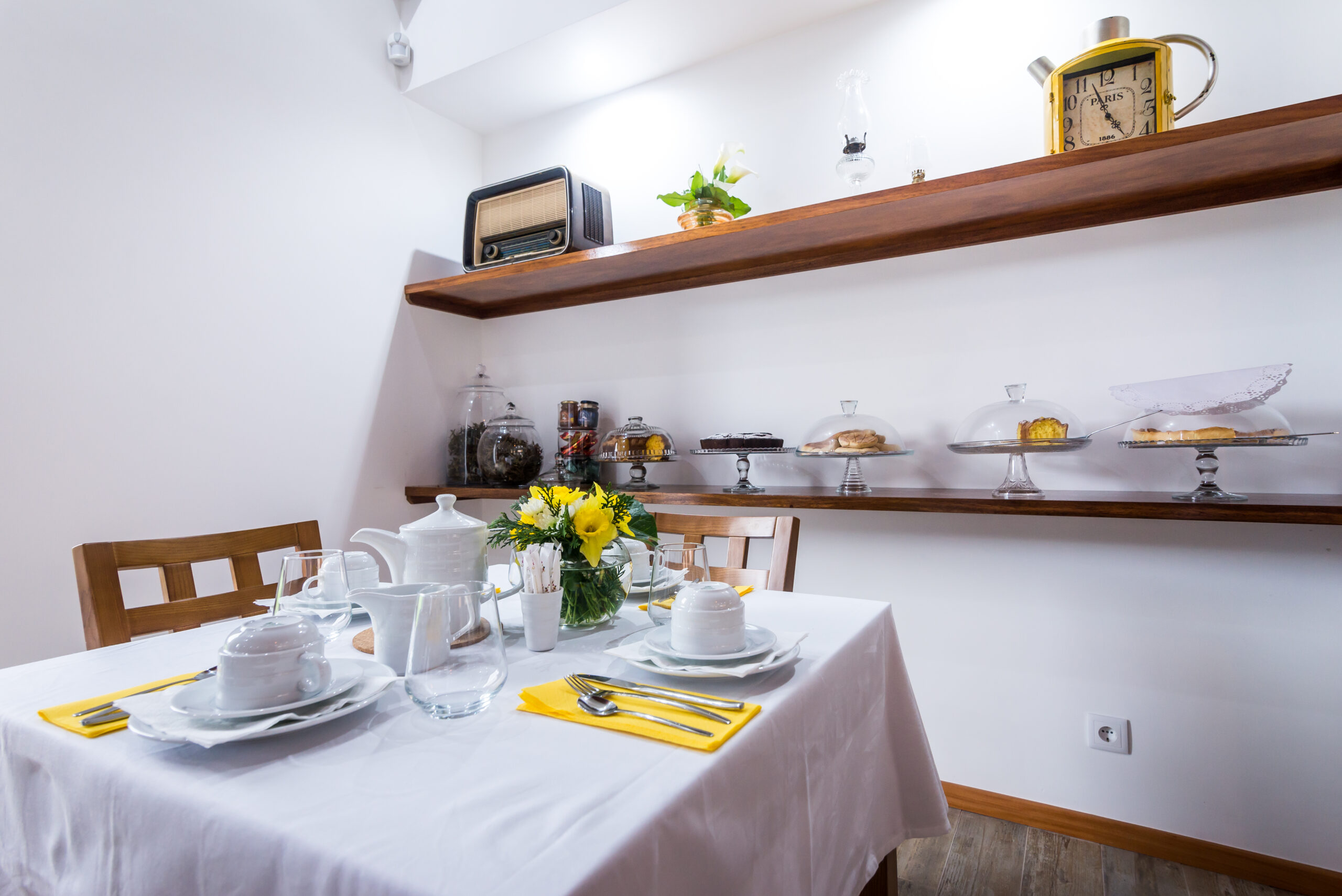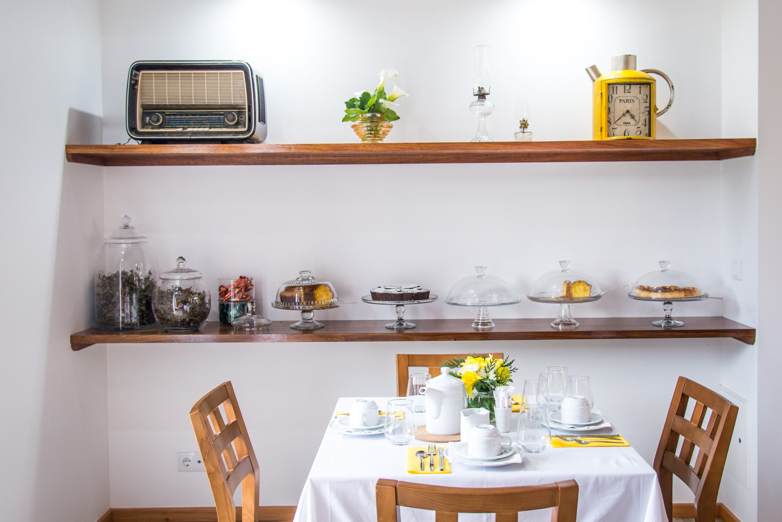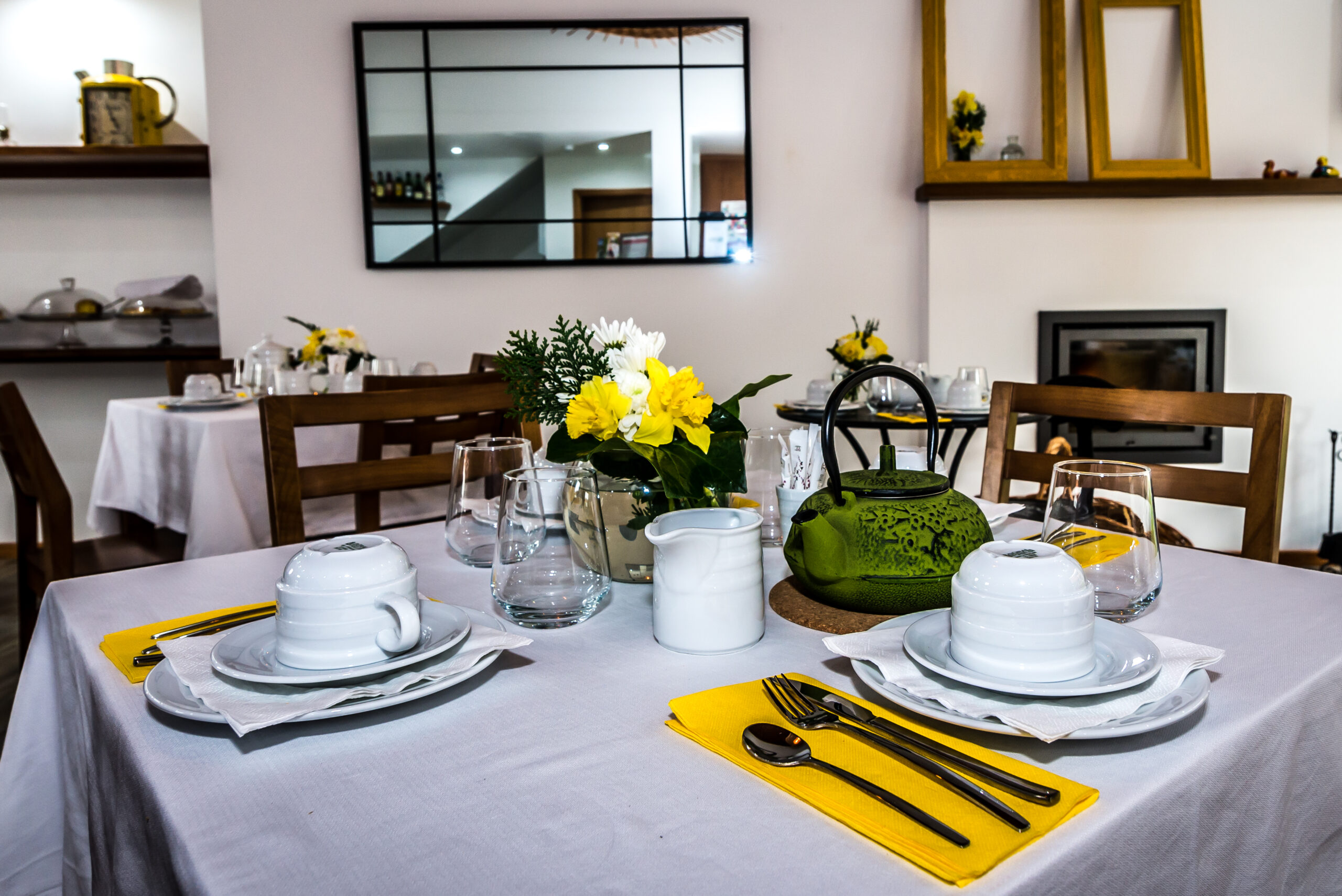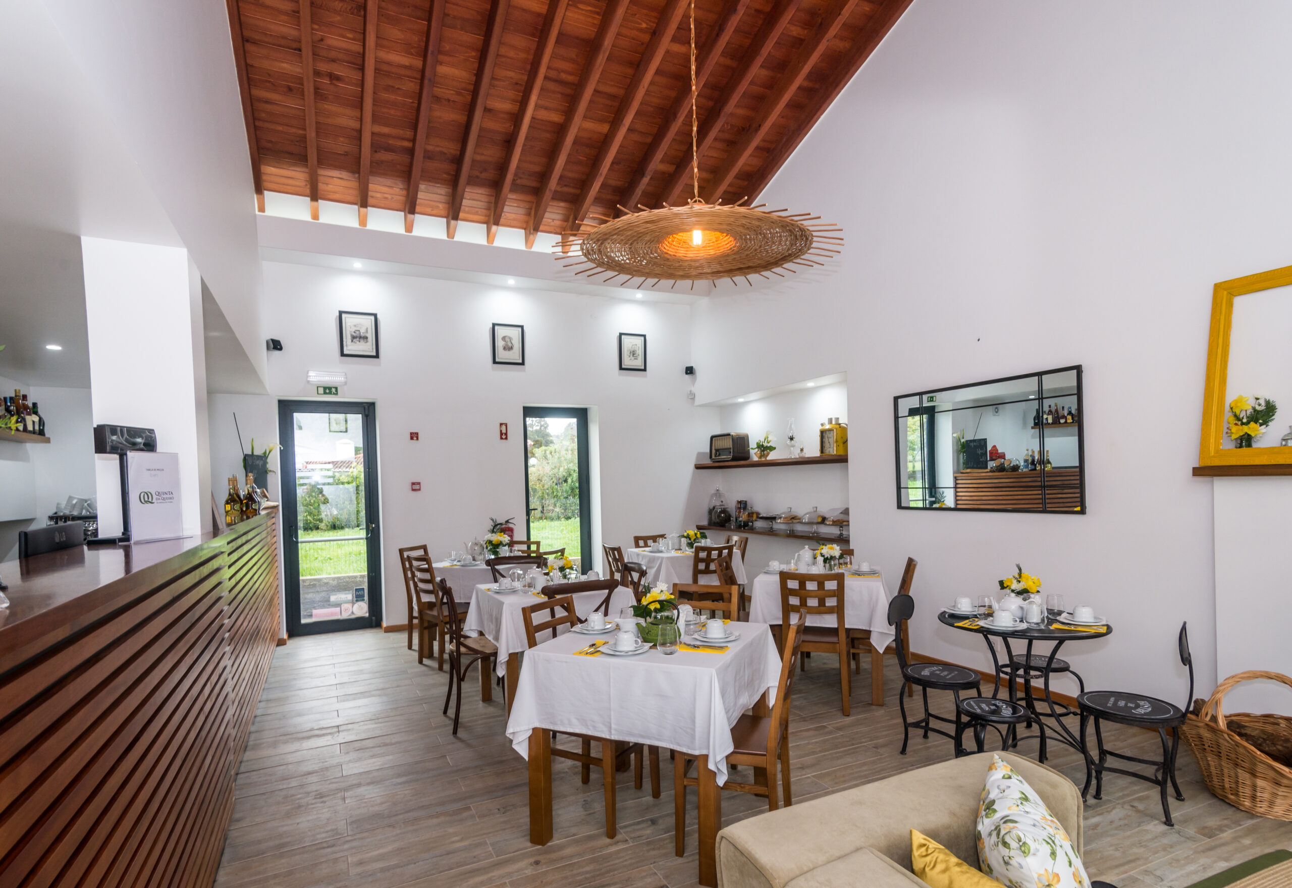 A sala de chá surge neste empreendimento como espaço de divulgação dos sabores tradicionais de doçaria e padaria, chás, licores, entre outros produtos únicos desta região servidos nos pequenos-almoços, lanches ou merendas. Visa, em primeiro lugar, a promoção dos produtos regionais bem como, a promoção de produtos nacionais. Neste espaço o cliente é recebido numa sala com ambiente confortável, sempre ornamentada com flores naturais de acordo com a época e estação do ano, bem como dias festivos a comemorar. Nesta sala, a presença das madeiras é uma constante assim como, o trabalho manual de artesãs em alguns adornos/adereços a utilizar como por exemplo nas toalhas de resguardo das cestas de pão, biscoiteiras, fundos de tabuleiros, entre outros. A sala possui uma lareira, alimentada a lenha, que é acesa sempre que necessário a fim de proporcionar mais conforto e bem-estar a quem nos visita. A degustação dos nossos produtos é feita em ambiente calmo, acolhedor e de cariz familiar, onde a música é uma constante. Se o cliente preferir poderá usufruir de uma esplanada ao ar livre, coberta ou não, adjacente à sala de chá. Os produtos vendidos são confecionados, na cozinha do empreendimento usando sempre produtos frescos de qualidade, típicos de cada época e característicos da nossa região.